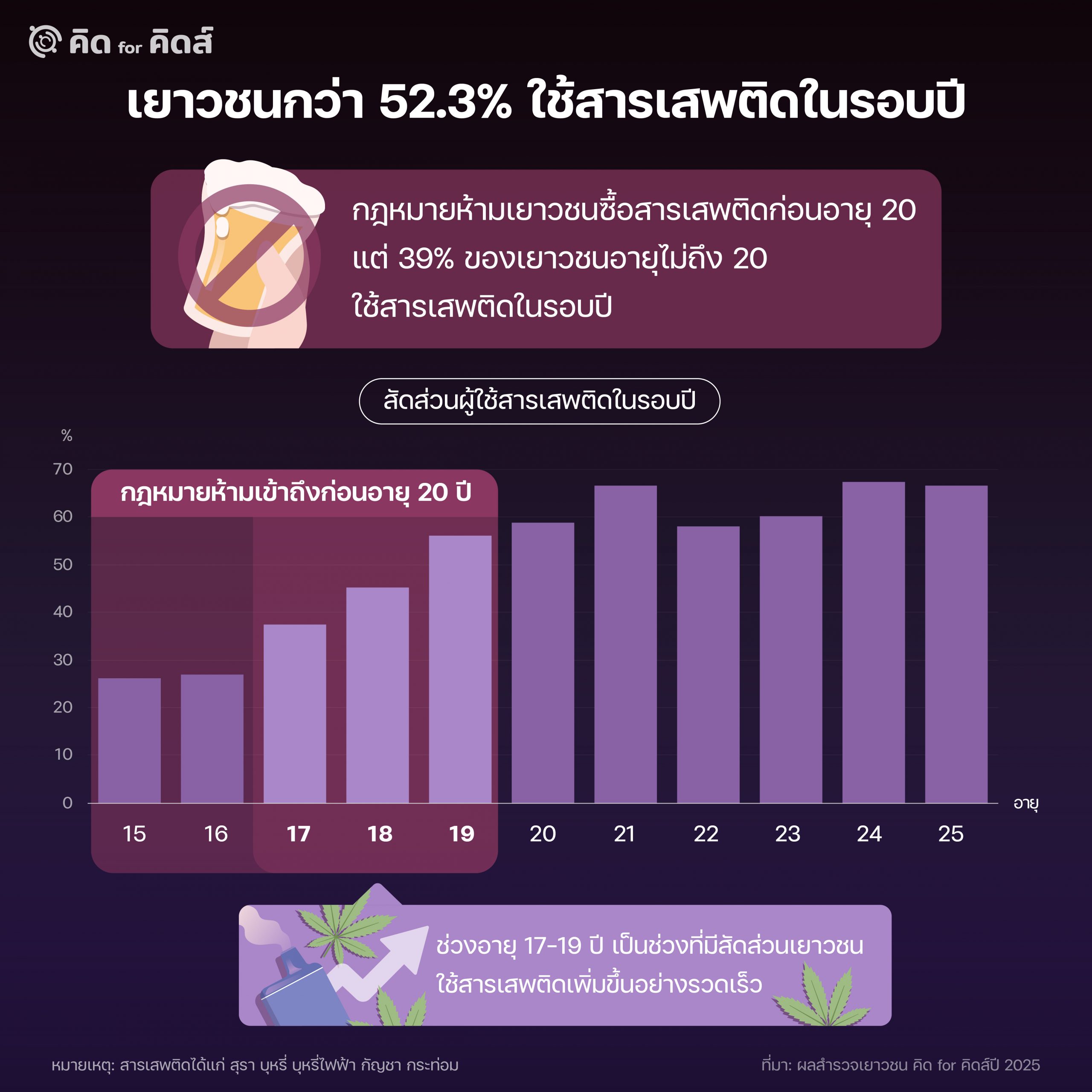 ถึงแม้หลายฝ่ายจะพยายามอย่างหนักเพื่อป้องกันไม่ให้เยาวชนเข้าไปเกี่ยวพันกับสารเสพติด แต่จากข้อมูลตามผลสำรวจเยาวชน คิด for คิดส์ปี 2025 พบว่าคนรุ่นใหม่ (อายุตั้งแต่ 15-25 ปี) มากกว่าครึ่ง (52.3%) เคยเสพสารเสพติด ไม่ว่าจะเป็น สุรา บุหรี่มวน บุหรี่ไฟฟ้า กัญชา หรือกระท่อม อย่างน้อยหนึ่งชนิดในรอบปี และเยาวชนที่อายุตั้งแต่ 20 ปีขึ้นไปประมาณ 60% เคยใช้สารเสพติดเหล่านี้ในรอบปี (ซึ่งส่วนมากกลุ่มนี้คือเยาวชนที่เคยใช้สุราในรอบปี) สะท้อนให้เห็นว่าเยาวชนไทยส่วนมากมีแนวโน้มที่จะคุ้นเคยกับสารเสพติดเหล่านี้