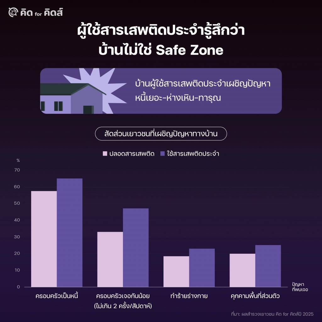 ในผลสำรวจฯ ปี 2025 เองก็พบว่าเมื่อเทียบกับผู้ที่ไม่ใช้สารเสพติดเลย ผู้ที่ใช้สารเสพติดเป็นประจำมีสัดส่วนที่เผชิญปัญหาในครอบครัวที่มากกว่า ไม่ว่าจะเป็น 1) ครอบครัวเป็นหนี้มากกว่า ซึ่งอาจส่งผลสร้างความกดดันและความเครียดต่อเยาวชน 2) ครอบครัวมีแนวโน้มพบเจอหน้ากันน้อยกว่า มีความห่างเหินกันในครอบครัวมากกว่า 3) ถูกครอบครัวคุกคามมากกว่าทั้งเคยถูกทำร้ายร่างกายมากกว่า และถูกคุกคามพื้นที่ส่วนตัวมากกว่า