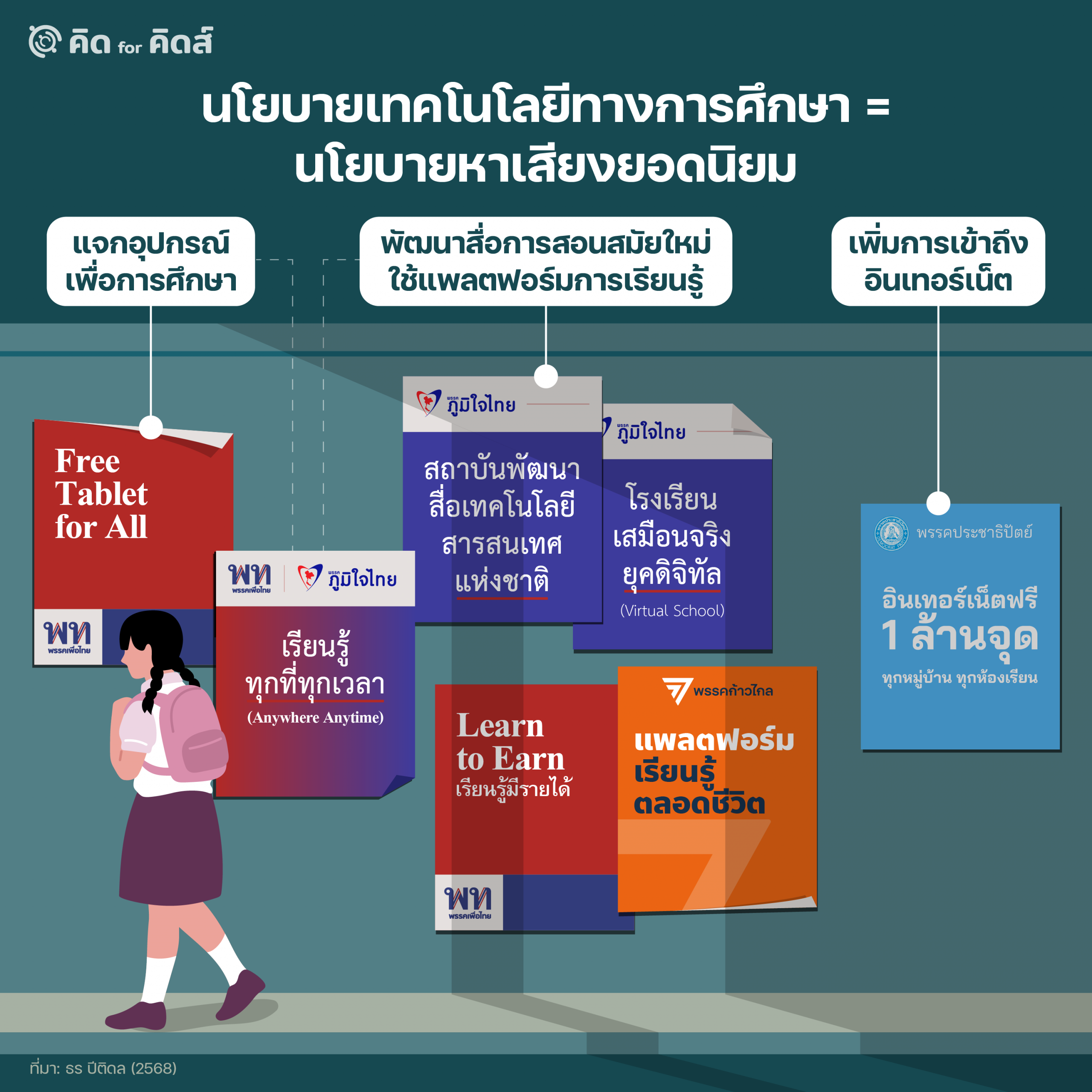 นโยบายเทคโนโลยีด้านการศึกษาเป็นหนึ่งในนโยบายยอดนิยมที่พรรคการเมืองไทยใช้หาเสียง และใช้มากยิ่งขึ้นในช่วงหลังการแพร่ระบาดของโควิด-19 ด้วยความหวังว่าจะช่วยเพิ่มการเข้าถึงการเรียนรู้ และลดความเหลื่อมล้ำ โดยเฉพาะในโรงเรียนขนาดเล็กที่ขาดครูครบชั้นหรือครบสาระวิชา