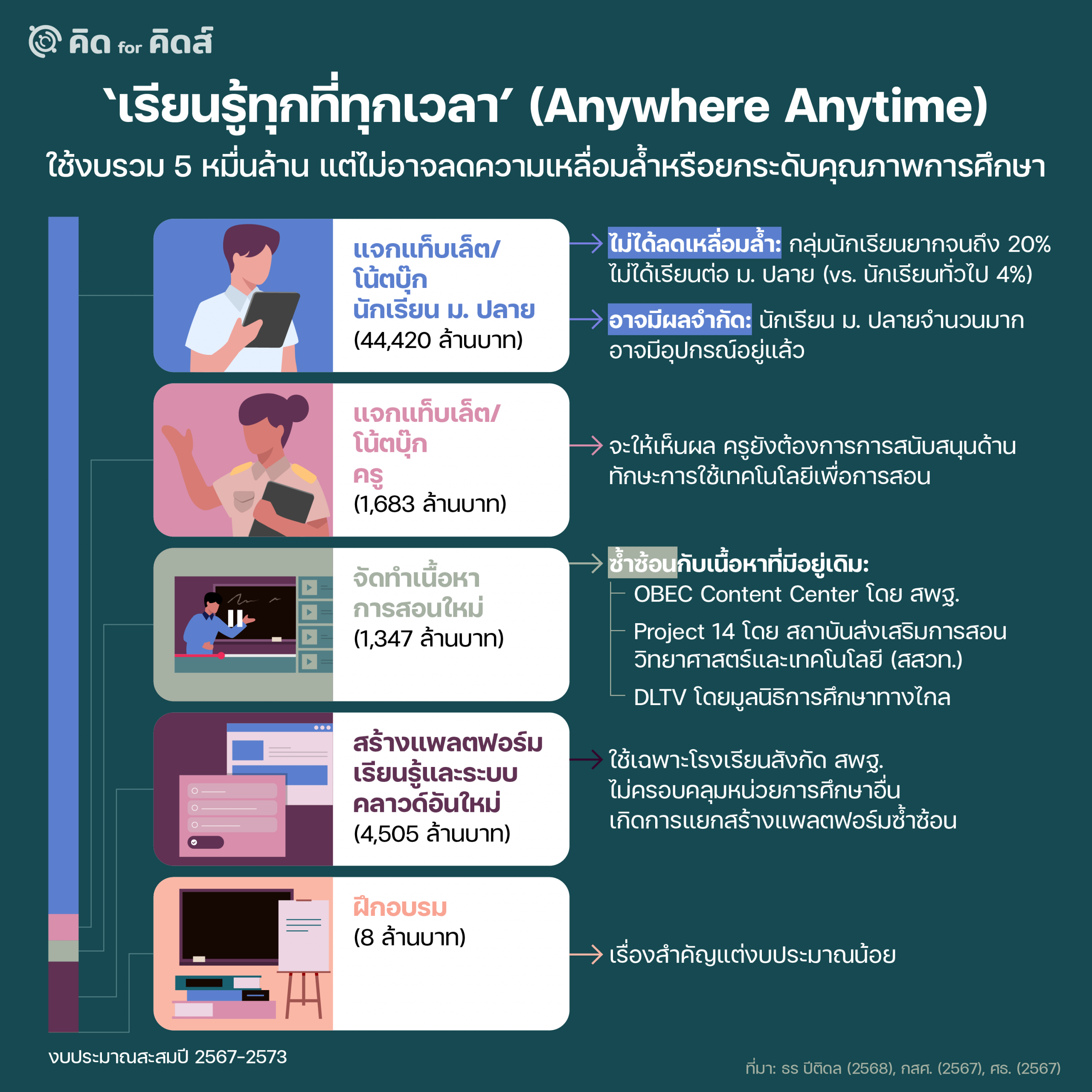 • ‘เรียนได้ทุกที่ ทุกเวลา’ (Anywhere Anytime) เป็นนโยบายเร่งด่วนของรัฐบาล แต่จนถึงปัจจุบันก็ยังไม่ลุล่วง โดยความล่าช้าเกิดจากการใช้งบประมาณสูงที่ต้องผ่านขั้นตอนงบและระเบียบจัดซื้อจัดจ้างที่เข้มงวด อีกทั้งยังมีคำถามต่อประโยชน์ที่แท้จริง เนื่องจากรายละเอียดการใช้งานและการวางแผนยังไม่ชัดเจน