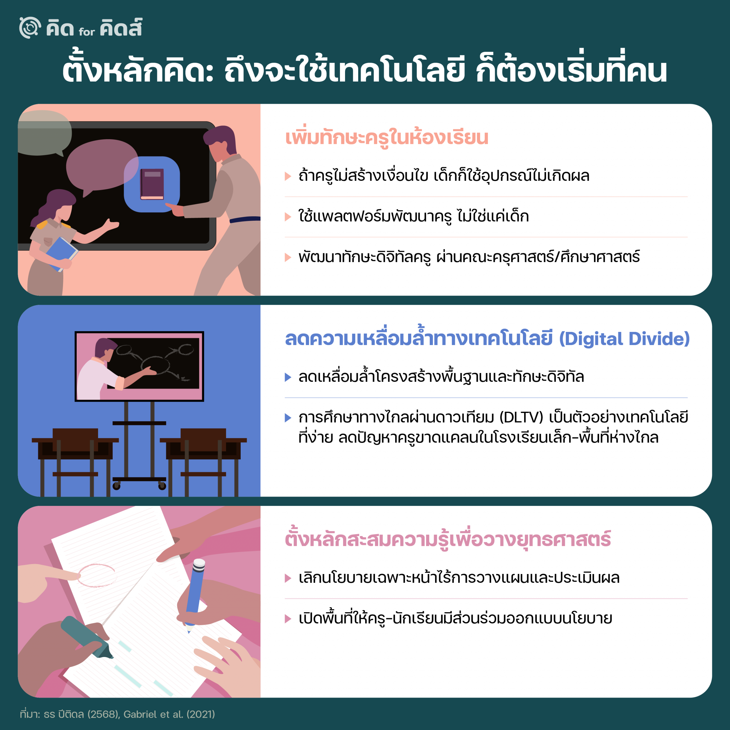 • รัฐบาลควรตั้งหลักคิดกับ 'การใช้เทคโนโลยีเพื่อการศึกษา' อย่างแท้จริง ทั้งการทบทวนช่องว่างที่มีอยู่ในระบบ พัฒนาทรัพยากรมนุษย์ให้กับผู้เกี่ยวข้องเพื่อเตรียมความพร้อมในอนาคต และเพิ่มช่องทางการมีส่วนร่วมจากครูและนักเรียนในการกำหนดนโยบาย