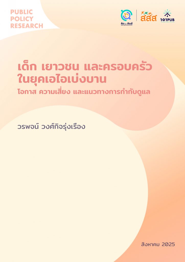 รายงานฉบับนี้คือบทสำรวจวรรณกรรมต่างประเทศในหัวข้อ “เด็ก เยาวชน และครอบครัวในยุคเอไอเบ่งบาน: โอกาส ความเสี่ยง และแนวทางกำกับดูแล” โดยมุ่งศึกษาทำความเข้าใจว่า 1) ปัญญาประดิษฐ์หรือเอไอคืออะไร เทคโนโลยีเอไอรูปแบบต่างๆ ทำงานอย่างไร และเด็กปฏิสัมพันธ์กับเอไอในลักษณะไหนและมันมีความหมายกับพวกเขาอย่างไร 2) กรอบในการกำกับดูแลเอไอผ่านแว่นตาสิทธิเด็กคืออะไร เราจะแปลงแนวคิดเชิงนามธรรมอย่างสิทธิเด็กเป็นแนวปฏิบัติที่ใช้ได้จริงอย่างไร 3) อะไรคือความเสี่ยงและโอกาสที่มาพร้อมกับเทคโนโลยีเอไอ แล้วเราจะเสริมฐานความรู้เอไอ (AI literacy) ให้กับเด็ก เพื่อหลีกเลี่ยงไม่ให้ความเสี่ยงกลายเป็น “อันตราย” ขณะเดียวกันก็แปลงโอกาสให้เป็น “ประโยชน์” กับเด็กได้อย่างไร และ 4) มีกรอบนโยบายและเครื่องมืออะไรบ้างที่ใช้กำกับเอไอเพื่อประโยชน์สูงสุดของเด็ก รวมถึงผู้มีส่วนได้เสียหลักอย่างบริษัทเอกชน ภาครัฐ และผู้ปกครอง ควรดำเนินการอย่างไรเพื่อบรรลุเป้าหมายดังกล่าว