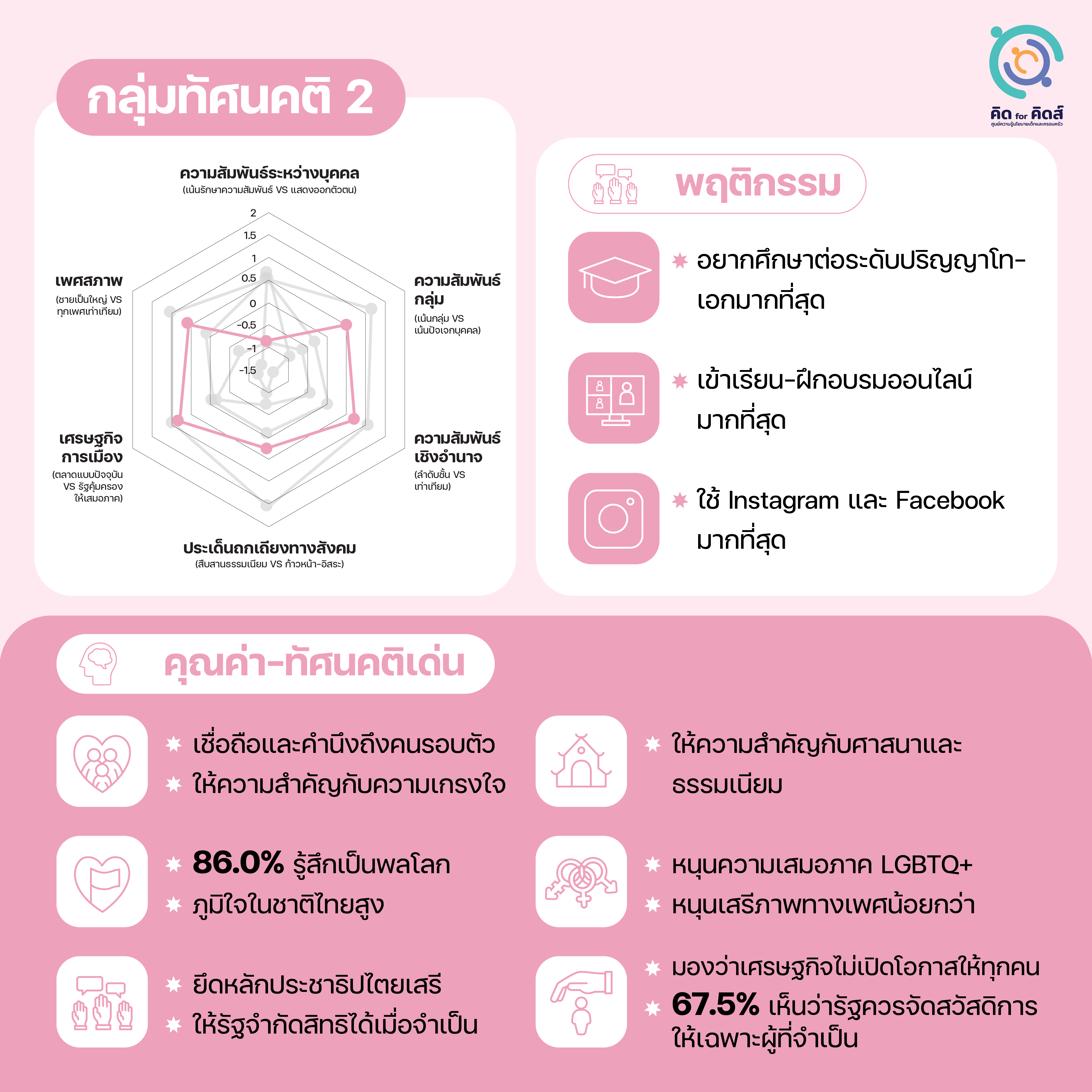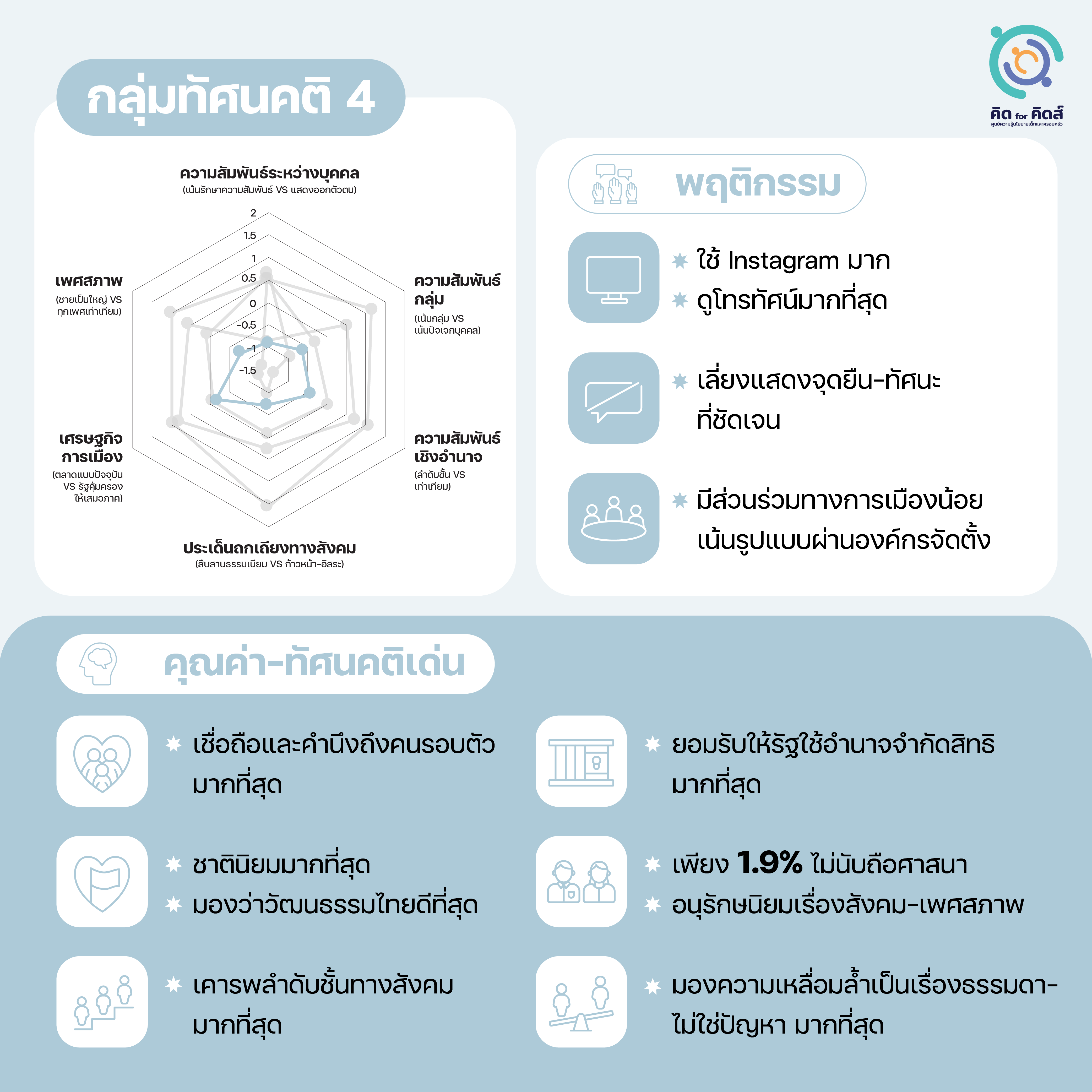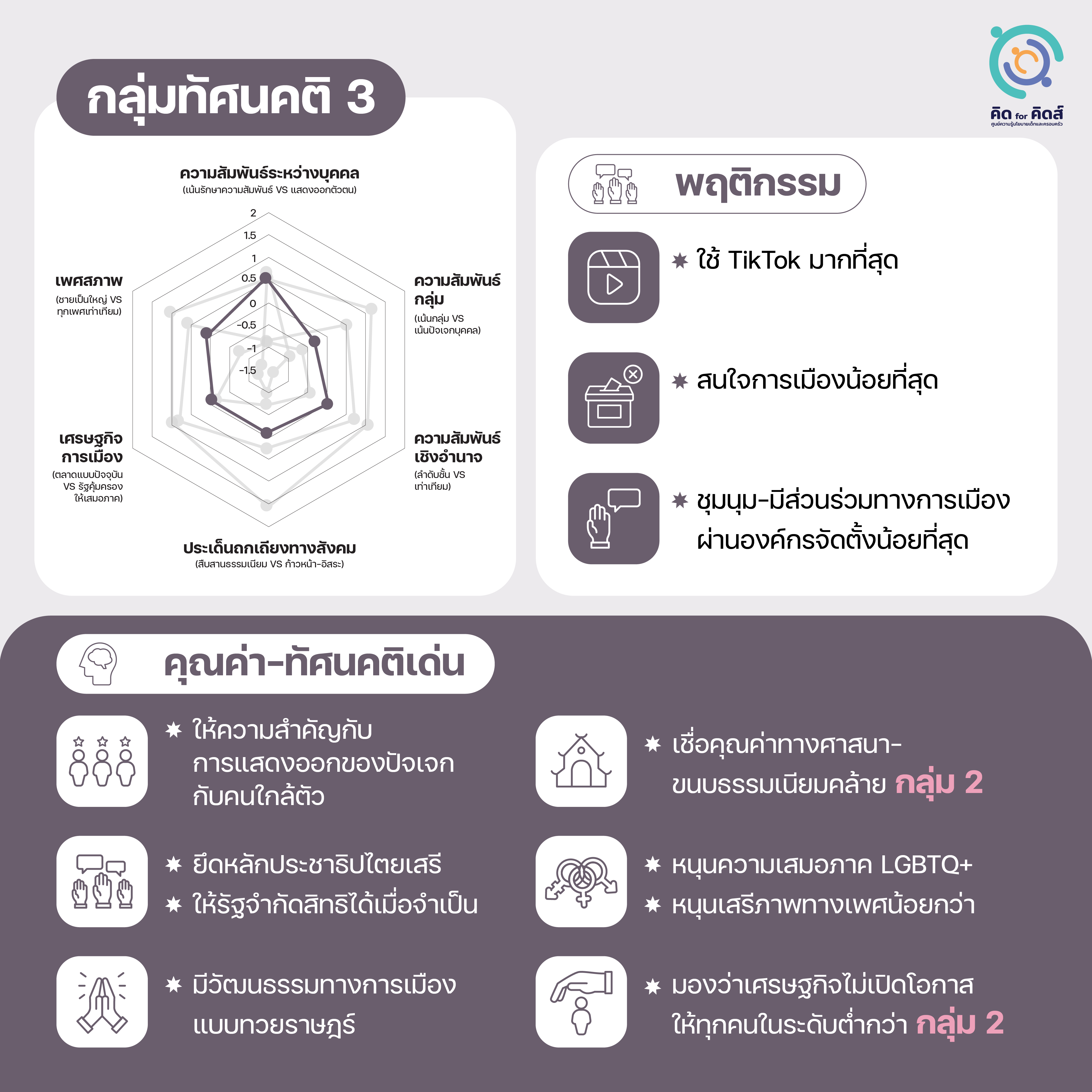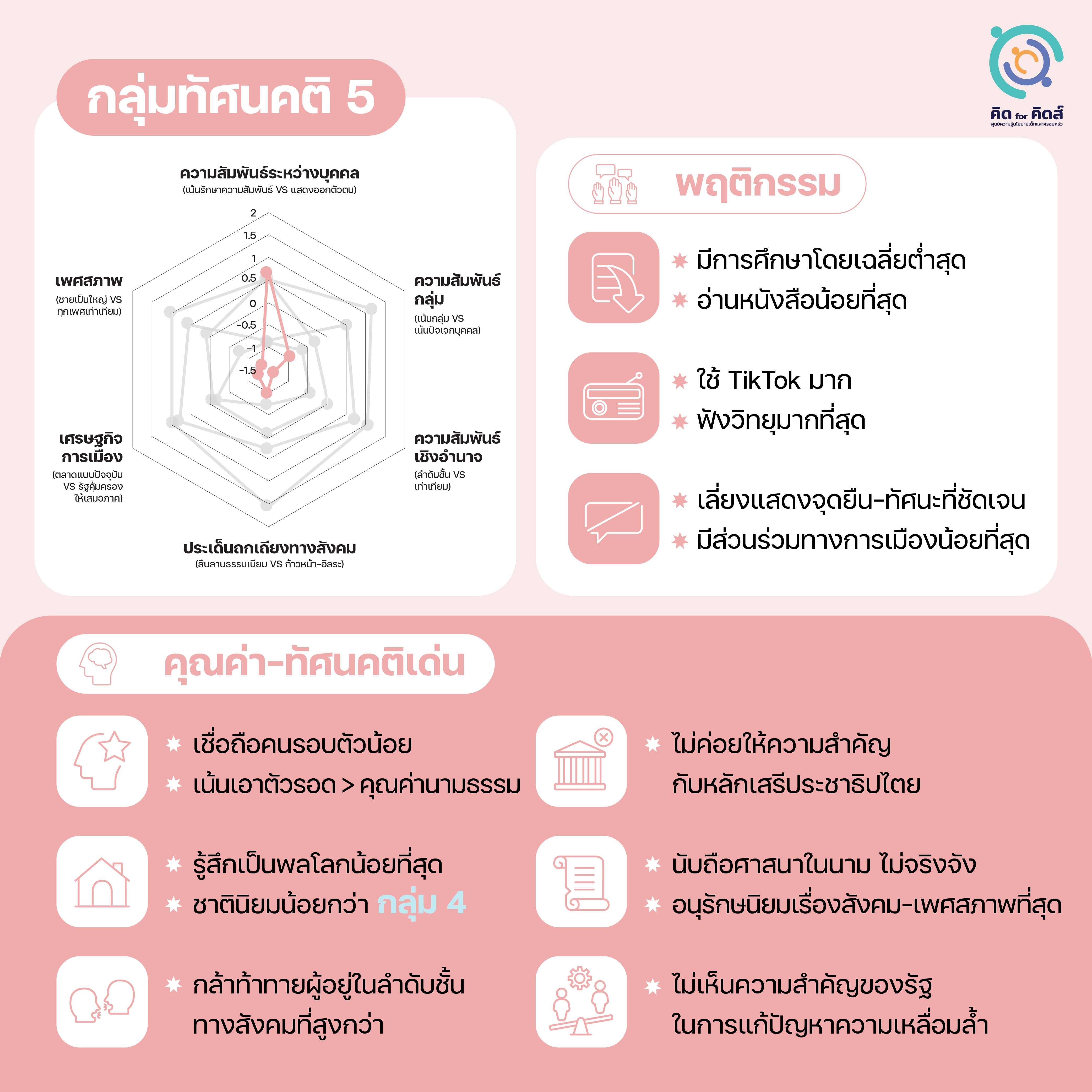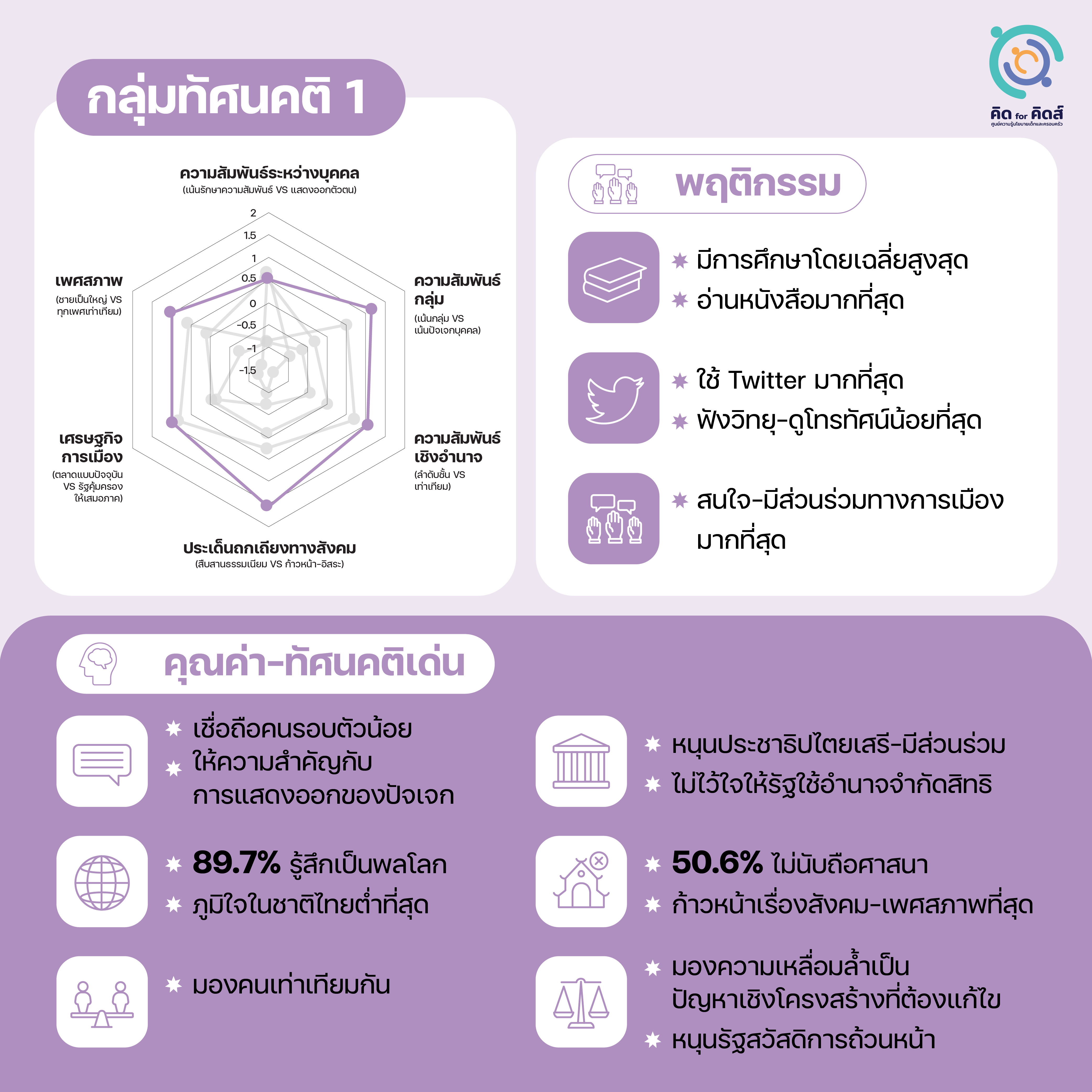 [6] วิเคราะห์โดยอาศัยการจัดกลุ่มทัศนคติจาก: วรดร เลิศรัตน์ และ กษิดิ์เดช คำพุช, เข้าใจตัวตน-ความคิดของ ‘เด็กสมัยนี้ ’; ฉัตร คำแสง และคณะ, ผลสำรวจเยาวชนของ คิด for คิดส์ .