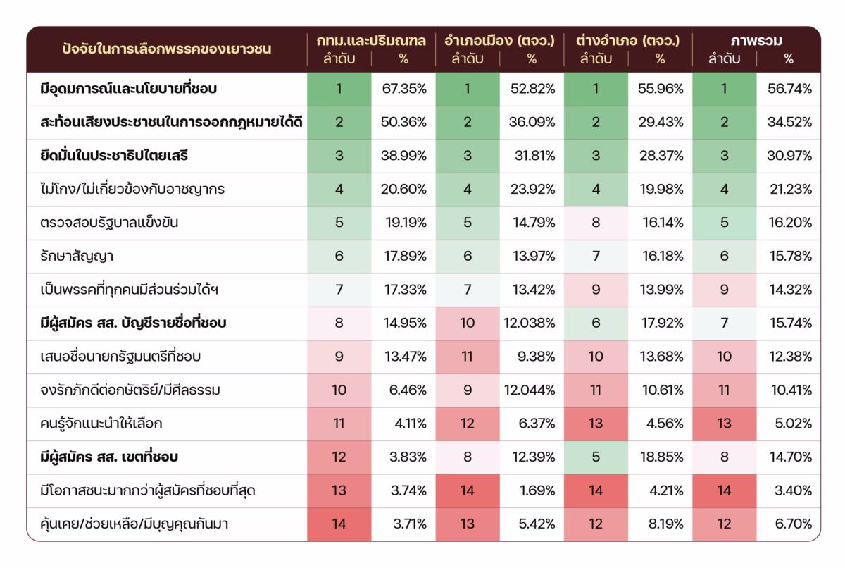ตารางแสดงลำดับความสำคัญและสัดส่วนเยาวชน แยกตามเหตุผลในการเลือกพรรคและพื้นที่